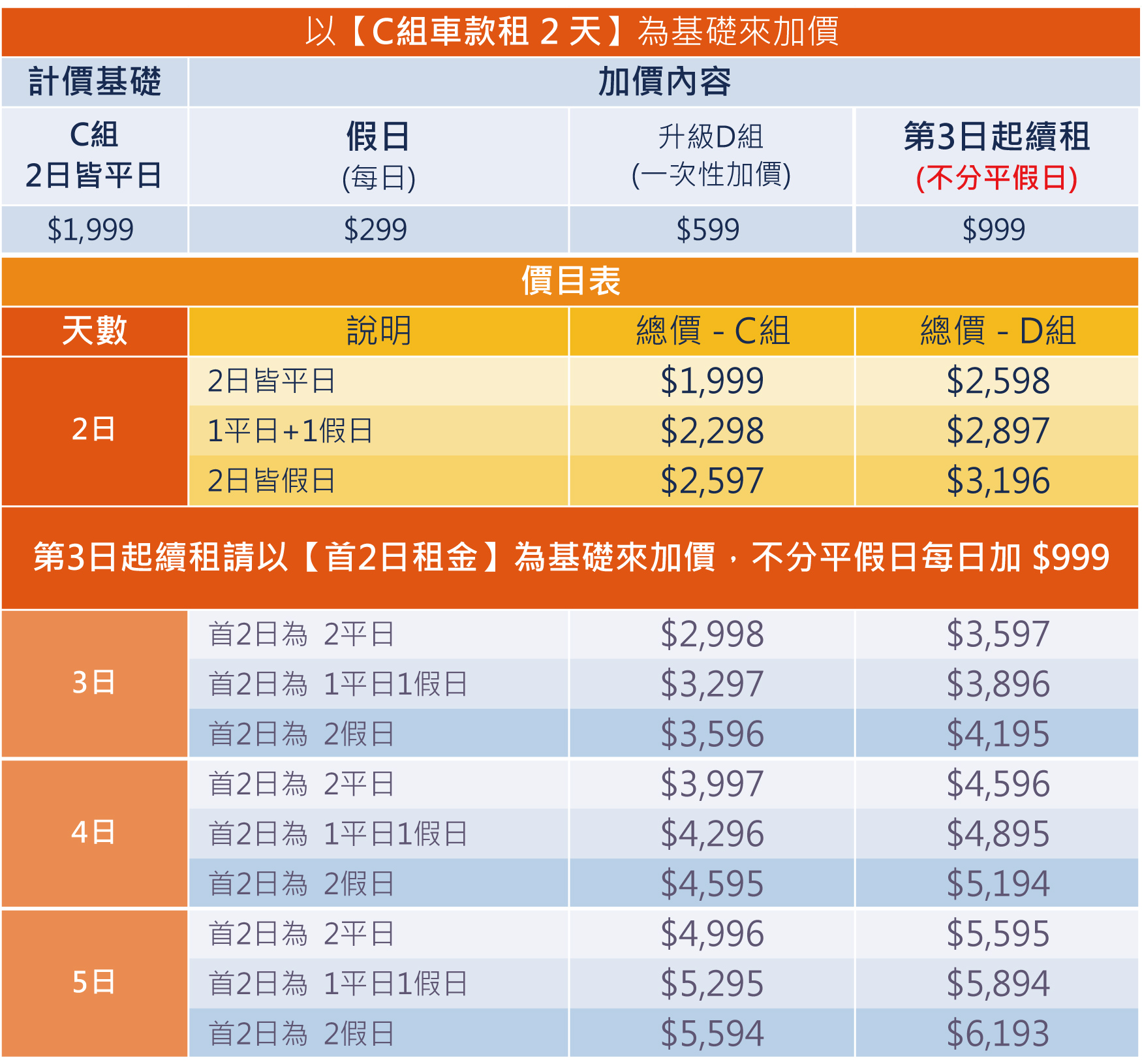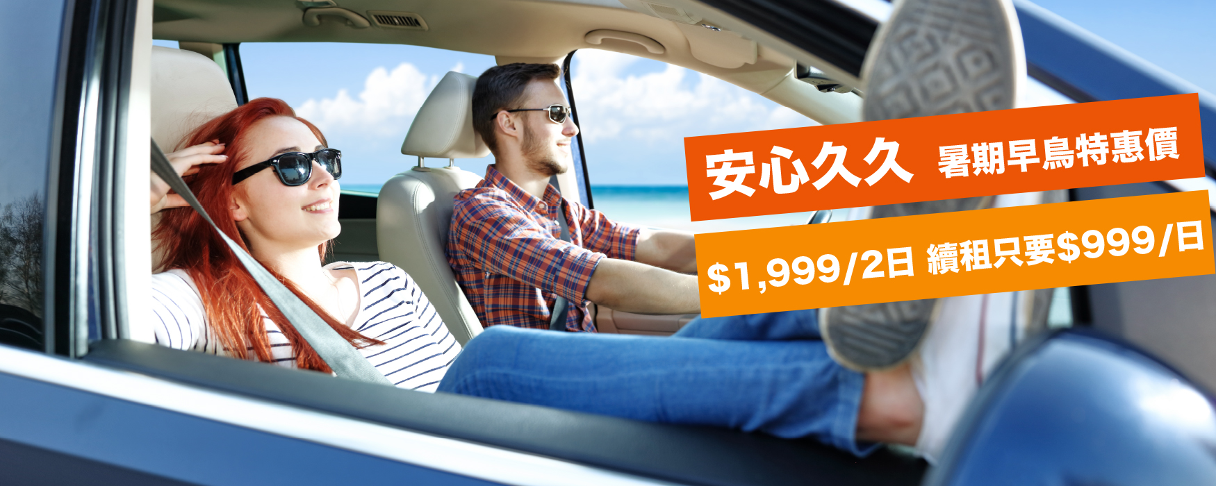 ˙ 本優惠僅適用於連續承租 C 或 D 組車款 2日(含)以上,適用取車日為2020/7/1 - 2020/8/31。